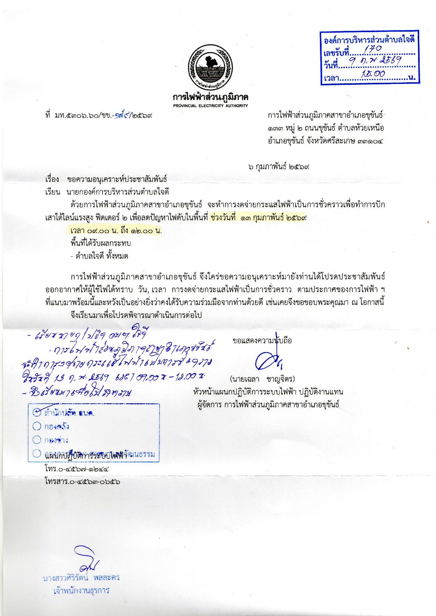 หัวข้อ :: การไฟฟ้าส่วนภูมิภาคสาขาอำเภอขุขันธ์ แจ้งงดจ่ายกระแสไฟฟ้าเป็นการชั่วคราวในพื้นที่ตำบลใจดี